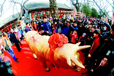 二月四日,北京市东城区建国门街道举行立春文化节?!氨薮虼号!泵袼谆疃谌褐谥谢鹑冉?,民众和春姑娘一起鞭打春牛,祈福新年好彩头。