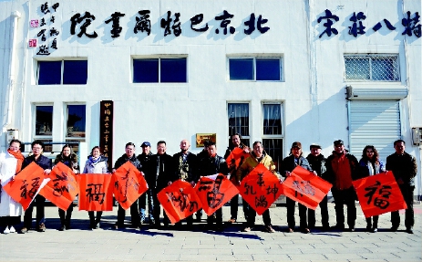 图为北京宋庄艺术家党支部书记巴特尔和艺术家们一起为宋庄的百姓写春联、书写福字,给百姓带去美好祝愿。