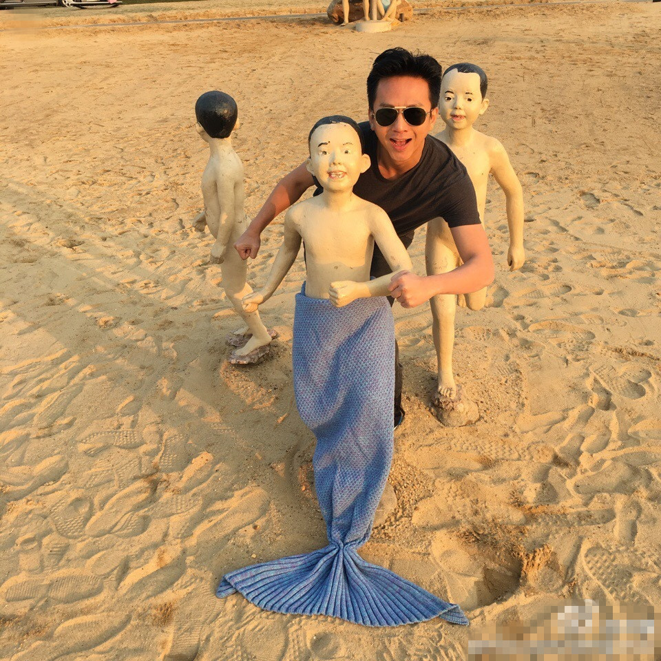 照片里,邓超扮成一条“美人鱼”与沙滩上的人像“嬉戏”,很是欢乐。