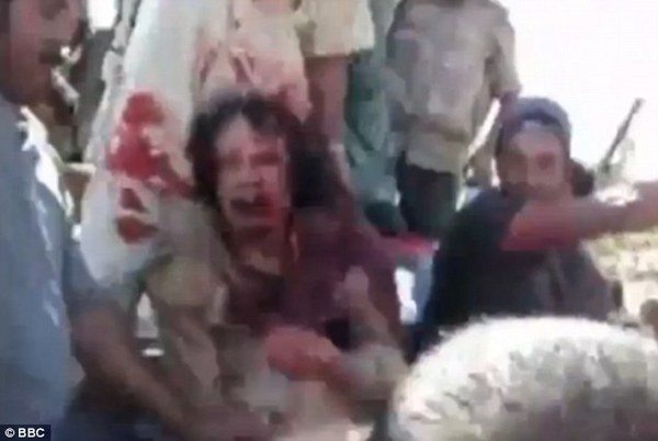 卡扎菲在苏尔特的住所被炮火夷为平地,被发现时,卡扎菲躲在苏尔特市中心一处水泥下水道内,他冲包围过来的执政当局军队清晰地喊:“别开枪!别开枪!”。图为卡扎菲满脸是血。