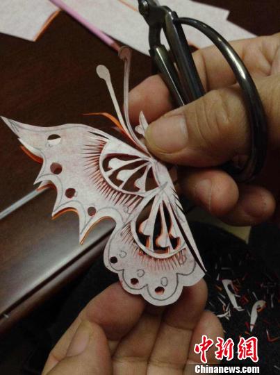 齐秀花现场为记者剪蝴蝶?!∩臣?摄