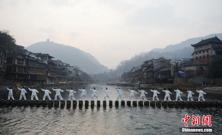 2月6日清晨,湖南凤凰县太极协会的太极拳爱好者们在凤凰古城的沱江边打起了太极,以此迎接即将到来的春节,呼吁大家健康养生。 杨华峰 摄