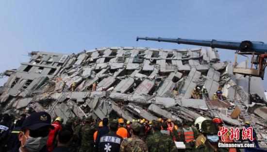 2月6日晨,台湾南部发生强烈地震。台南市因地震倒塌的维冠大楼致多人伤亡。图为救援队逐层搜寻受困者。中新社记者 刘舒凌 摄