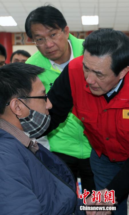 2月8日,台湾当局领导人马英九(右)到台南市殡仪馆联合灵堂,向高雄地震罹难者致祭并慰问在场家属。中新社记者 刘舒凌 摄
