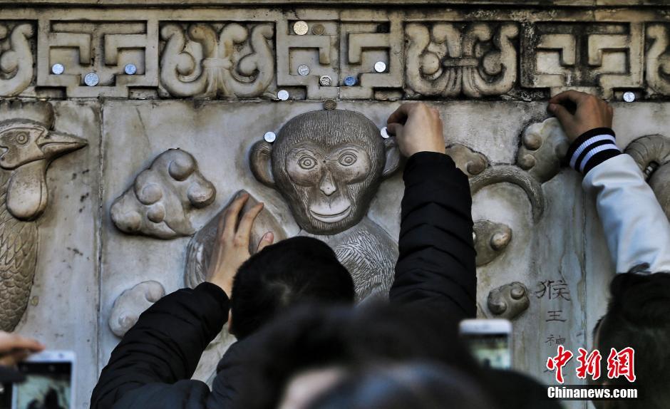 2月9日消息,猴年大年初一上午,北京白云观迎来近三万市民前来摸石猴,讨吉祥。香客们密密麻麻的身影遍及道观周边的每一条街道上?!懊铩钡亩游榕牌?00余米的长龙,一直蔓延到白云观东北面的护城河边。据白云观工作人员介绍,白云观前身是唐代的天长观,明初易名为白云观,很久以前就流传有“神仙本无踪,只留石猴在观中”的传说。也正因此,吸引了众多香客慕名而来。如今白云观山门处的石猴(福)已经被摸得发亮。图片来源:视觉中国