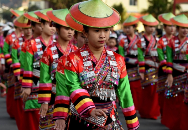 2月11日,“花腰傣”群众在花街节上巡游。新华社记者 蔺以光 摄