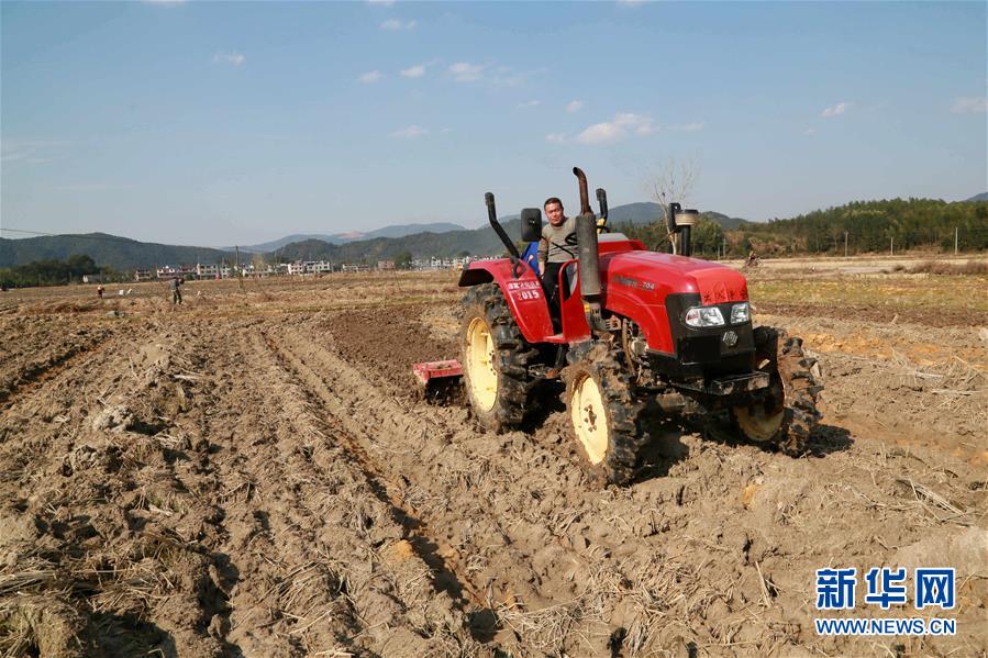 2月10日,在江西省峡江县马埠镇夏塘村,一位村民在田间犁地。春节期间,各地农民抓住晴好天气犁田松土,为新一年的春耕、春种作准备。 新华社发(陈福平 摄)