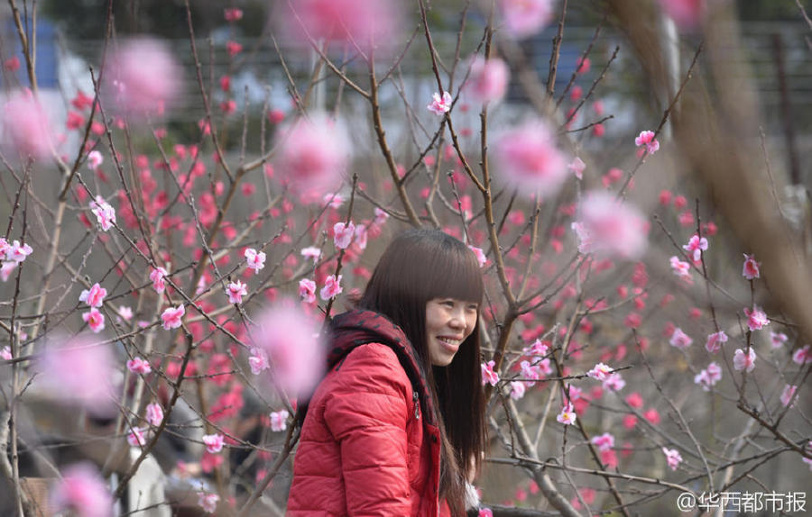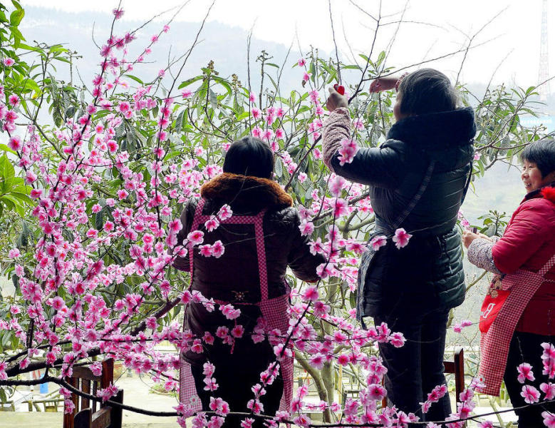 2月11日消息,成都龙泉山的农家乐因等不到桃花盛开,扎起假花,吸引游客。