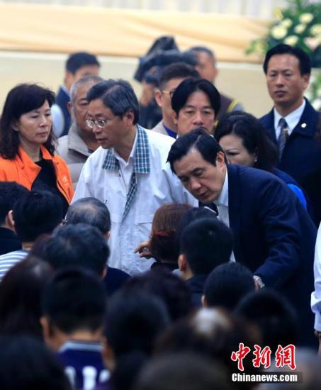 根据中华民族丧殡习俗,2月12日是台湾地震台南罹难者“头七”的日子,地震罹难者头七超荐法会在当地举行。台湾当局领导人马英九、行政机构负责人张善政(白衣立者)出席并向罹难者家属一一致意。 中新社记者 陈悦 摄