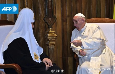 当地时间2月12日,罗马天主教教皇方济各和俄罗斯东正教大牧首基里尔在古巴会面。