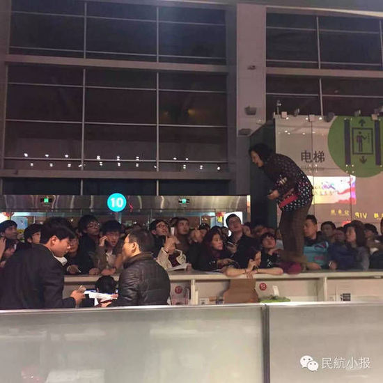 原标题:飞机延误:女子站柜台上表达不满