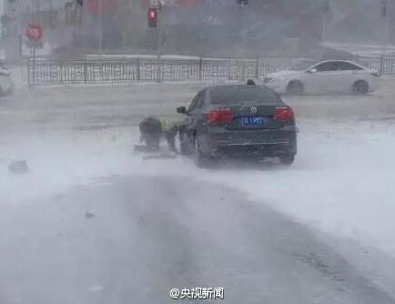 大连交警雪中推车 因太累马路上跪倒休息(图)