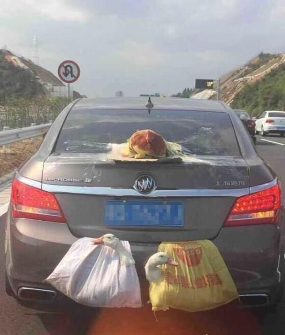 2016年2月13日,一广东号牌上海通用车后备箱,两个蛇皮袋装着鸭子一路往东莞走,可后车盖竟然还用透明胶捆着一只鸡,被网友拍下来迅速传播,微博、微信朋友圈马上沸腾,大伙儿惊呆了,这真的是双涡轮增“鸭”,后置发动“鸡”?