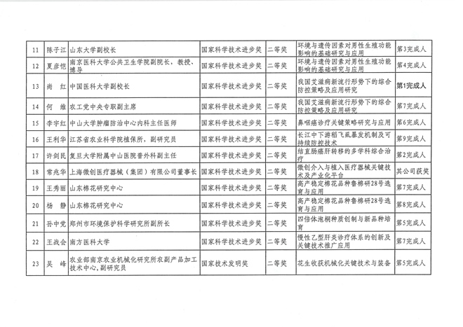 其中,全国人大常委会副委员长、农工党中央主席陈竺参与完成的“髓系白血病发病机制和新型靶向治疗研究”,农工党中央副主席何维参与完成的“我国艾滋病新流行形势下的综合防控策略及应用研究”等21个项目获得国家科技进步奖二等奖,农工党党员、贝达药业股份有限公司董事长丁列明和他的团队研发的抗癌项目——“小分子靶向抗癌药盐酸??颂婺峥⒀芯?、产业化和推广应用”,农工党党员、知名烧伤专家吕国忠参与完成的“中国人体表难愈合创面发生新特征与防治的创新理论与关键措施研究”分别获得国家科学技术进步奖一等奖。