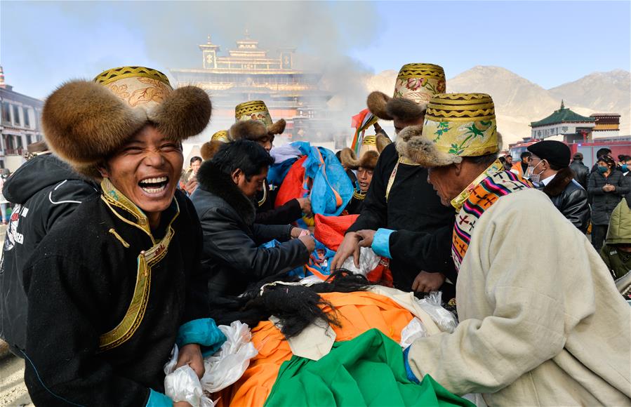 当日,位于西藏山南地区扎囊县境内的桑耶寺迎来一年一度的大经杆更换经幡仪式。众多信教民众把写有祝福、祈愿的经幡系在经杆上,表达新年新希望。按照传统习俗,这样的活动每年藏历新年期间举办一次。新华社记者 普布扎西 摄