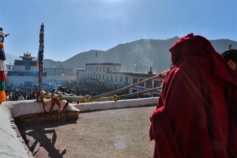 2月13日,桑耶寺僧人在大经杆更换经幡仪式上吹法号。
