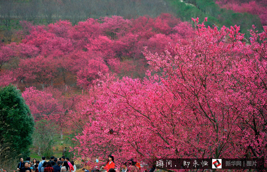 2016年2月14日,广东韶关某公园,樱花绽放,游客驻足欣赏、拍照留影,提前感受踏青赏花游花园乐趣。