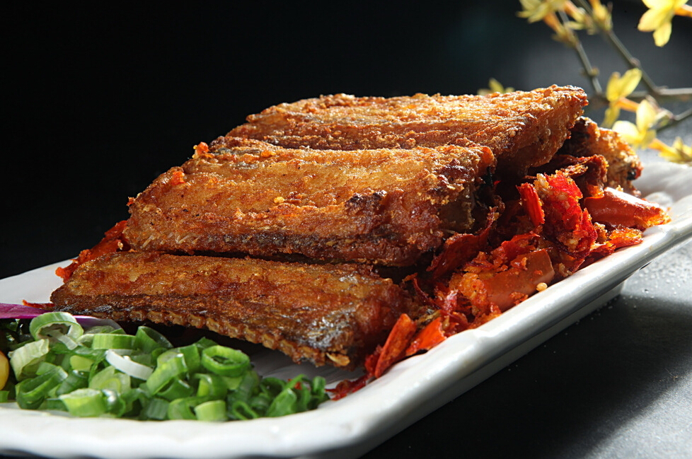 做法:将带鱼去肠、去头尾、刮鳞洗净后切成5厘米长的段。带鱼用姜末、花椒粉、大料粉、盐腌制一下,淀粉调水挂浆。锅中放植物油烧热,将带鱼段取出,逐个下入油锅,慢火炸至两面金黄时,捞出装盘,即可食用。