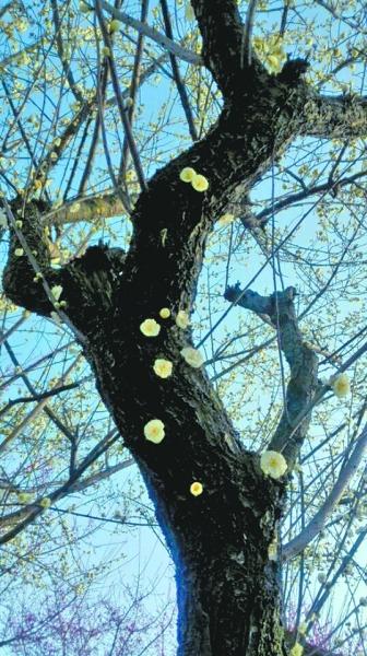 青山公园一棵老梅树上,许多梅花不是开在枝条上,而是直接开在树干上,形成“树干开花”的奇观。
