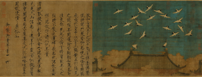 画本是好画,绘画技法精妙,图中群鹤如云似雾,生机盎然,一改常规花鸟画构图的传统方法,将飞鹤布满天空,一线屋檐既反衬出群鹤高翔,又赋予画面故事情节……卷后宋徽宗瘦金书题记及诗,也是挺劲爽利……可你一皇帝政治上不干实事,搞封建迷信,老百姓肯定不买你的账!