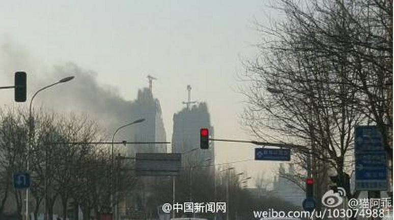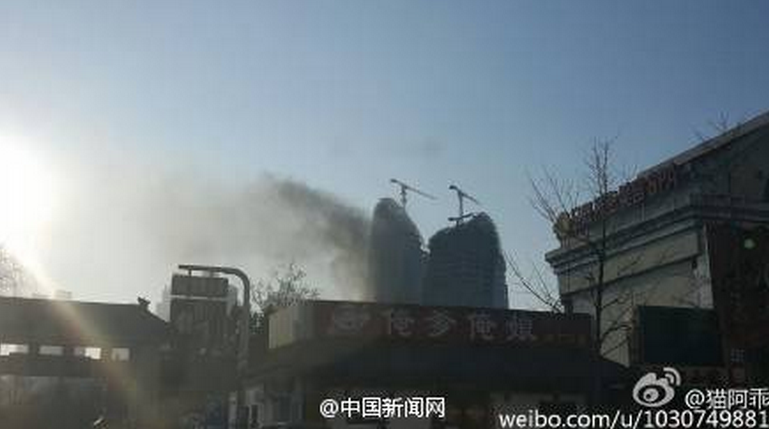 北京朝阳公园附近的阿玛尼公寓工地起火,消防车已经前去救援。