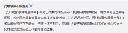 黑龙江省哈尔滨市旅游局指出,针对已核实的涉事饭店不以真实名称提供服务、餐饮许可证过期等问题,松北区市场监管局责令其停止经营活动,并进行行政处罚。
