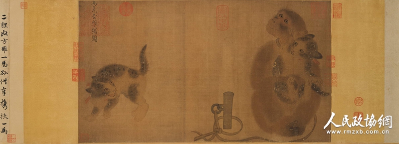 此绢本设色《猴猫图》卷,传为画猿名家易元吉所作精品,有宋徽宗题写的“易元吉猴猫图”字样。