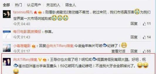 新浪娱乐讯 周星驰新作《美人鱼》票房破20亿,导演王晶清晨发微博恭喜周星驰,似是打破两人的不和传闻。然而16日23:13,向太陈岚在王晶微博下留言评论道:“王导你也太假了吧?明知票房假到离谱。好吧,祝冲出亚洲冲出宇宙至尽头!50亿破阿凡达纪录吧!不过我大牙会全部掉光了?!?/p>