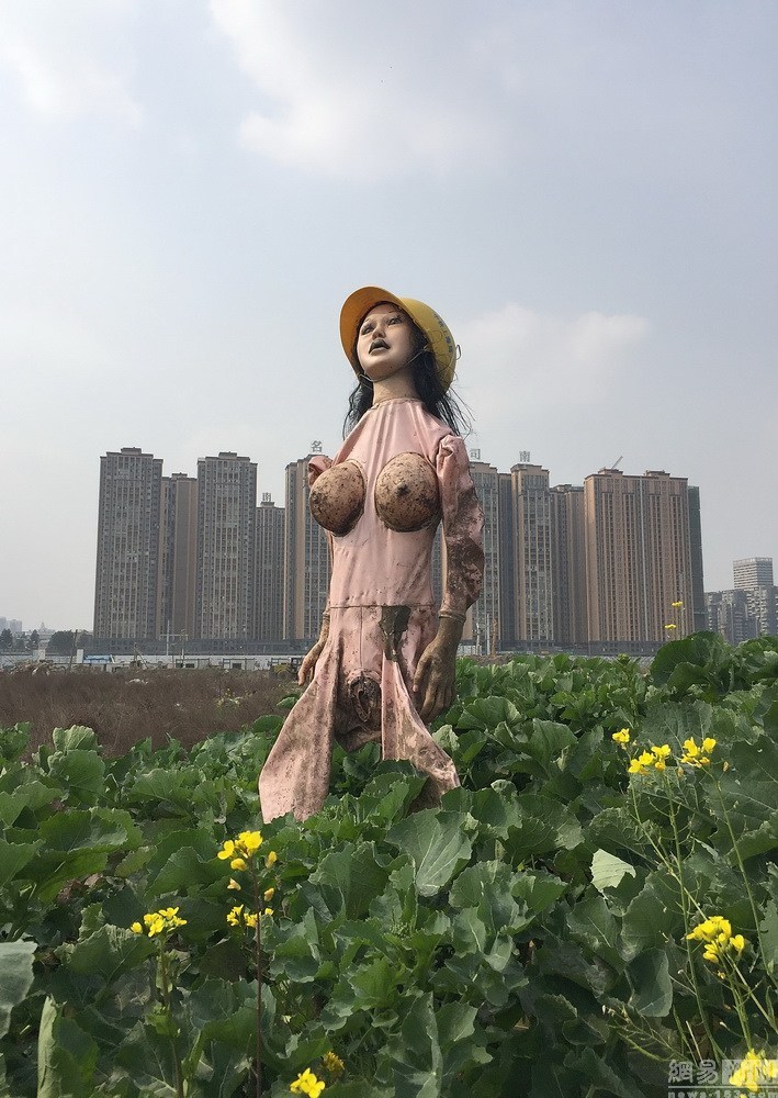 原标题:农民用充气娃娃“伪装”稻草人 "身材"玲珑