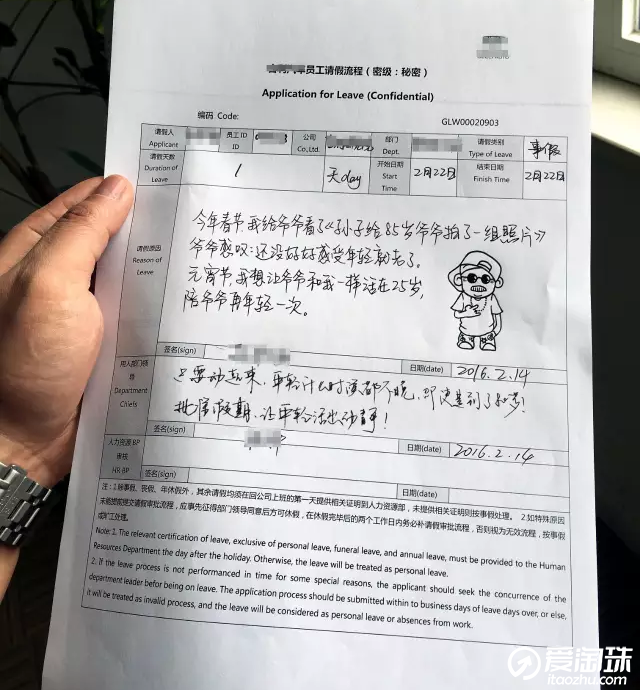 据悉,填写请假条的人是杭州一家大型汽车企业的员工顾先生,在请假条上,请假原因一栏写着“今年春节,我给爷爷看了《孙子给85岁爷爷拍了一组照片》。爷爷感叹,还没好好感受年轻就老了……元宵节我想陪爷爷再年轻一次。”并在旁边配上了手绘的“嘻哈老顽童”形象:墨镜、棒球帽……俨然一副潮人模样。