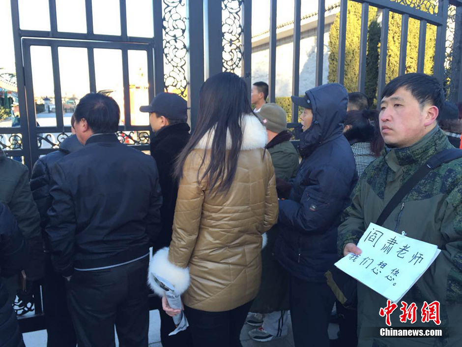 2016年2月12日3时07分,著名艺术家、空政文工团创作员阎肃同志因病在北京逝世。随后阎肃的儿子发布微博称,“我父亲阎肃平静地离开了尘世,没有任何痛苦,就像睡着了一样。老爸可能觉得已经完成了自己的使命,所以就这么离开了?!?图为各界民众和媒体等待送别。 中新网记者 李泊静 摄