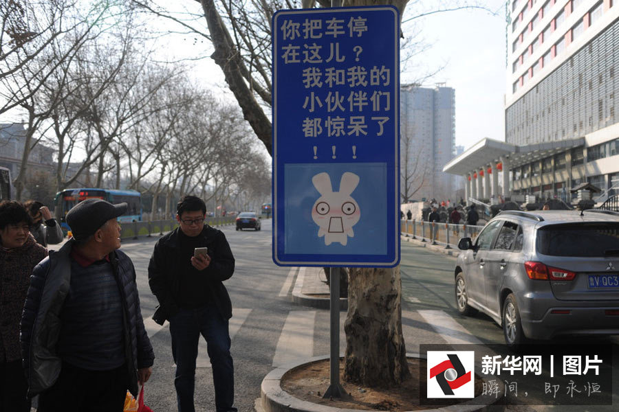 2016年2月17日,在济南齐鲁医院急症大门口,现“萌萌哒”趣味兔子交通警示牌。据了解,通过“萌萌哒”的提醒,吸引人们的注意,开怀一笑之后,提醒自己要严格遵守交通规则。图片来源:东方IC