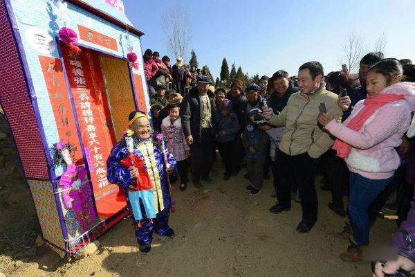 “这个想法已经有十几年了,年前的农历十月才确定要做,因为猴年是六十六大寿,时间就定在腊月二十八(2月6日),一是图个吉利,另外一个就是人气会比较旺?!闭诺卵嫠呒钦?,当天,附近村里的人都专程跑来观看,现场至少有一两千人。在采访张德样老人的过程中,他的手机不断响起,因为“活人出殡”一事,外地媒体也打来电话采访他。大众网记者注意到,张德样老人的一只眼睛有些问题,在阳光强烈的地方看不到东西,他看手机的时候都会跑进屋里的角落,借助手机屏幕上的光线,才能看清楚屏幕上的字。