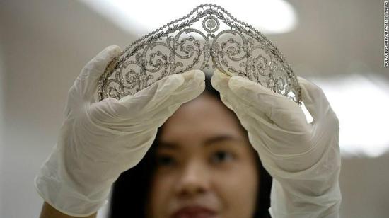 据CNN报道,1986年在伊梅尔达流亡夏威夷时,大批珠宝被扣在美国海关,目前这些珠宝将成为主要的拍卖物。其中,最稀有的是一颗25克拉的粉钻,据称 是一颗葡萄的形状,价值近500万美元。除此之外,珠宝中还有一顶卡地亚冕状头饰,当时价值5万美元,现在已足足翻了十倍。