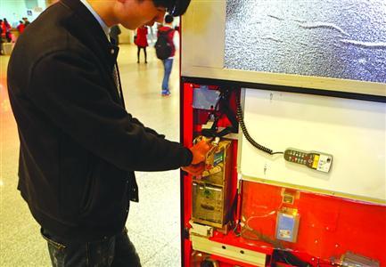 图说:虹桥火车站饮料自动贩售机维修人员将机器槽道内被卡硬币取出。图自新闻晨报