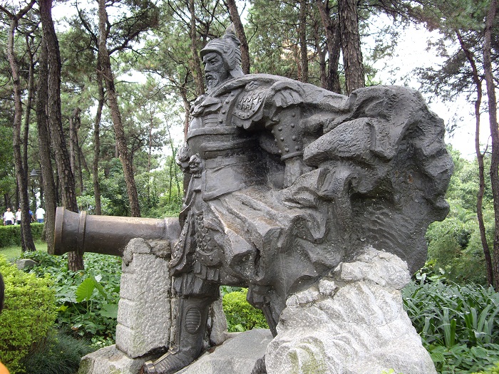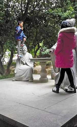 男童脚踩袁崇焕纪念园石像拍照(图片来自网络)