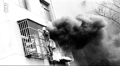 在这条10分钟左右的视频中,一栋居民楼中的一间屋子着火,火苗已蹿出窗外,并伴有大量黑烟。在着火屋子的隔壁房间,一名女子站在阳台防盗网里等待救援。而在防盗网外,一名身穿红色外套、头戴白色帽子的男子,沿着防盗网之间的空隙慢慢移动,试图救出这名女子。