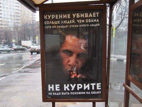 近日,在莫斯科街头出现一则广告,警告俄罗斯烟民称:吸烟导致的死亡比奥巴马杀死的人还要多。
