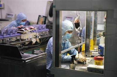 北京脐血库制备室里,工作人员将采集到的脐带血进行处理。