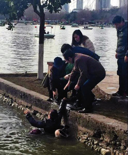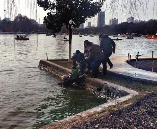 小伙与群众一起将小孩奶奶拉上岸