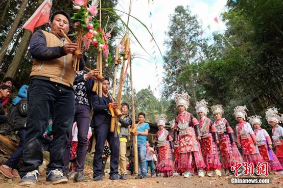 2月17日,农历正月初十,贵州省榕江县高同苗寨年味正浓,全村老少身着盛装欢聚寨门外,吹着芦笙,跳着古朴芦笙舞,共庆新春。 贺俊怡 摄