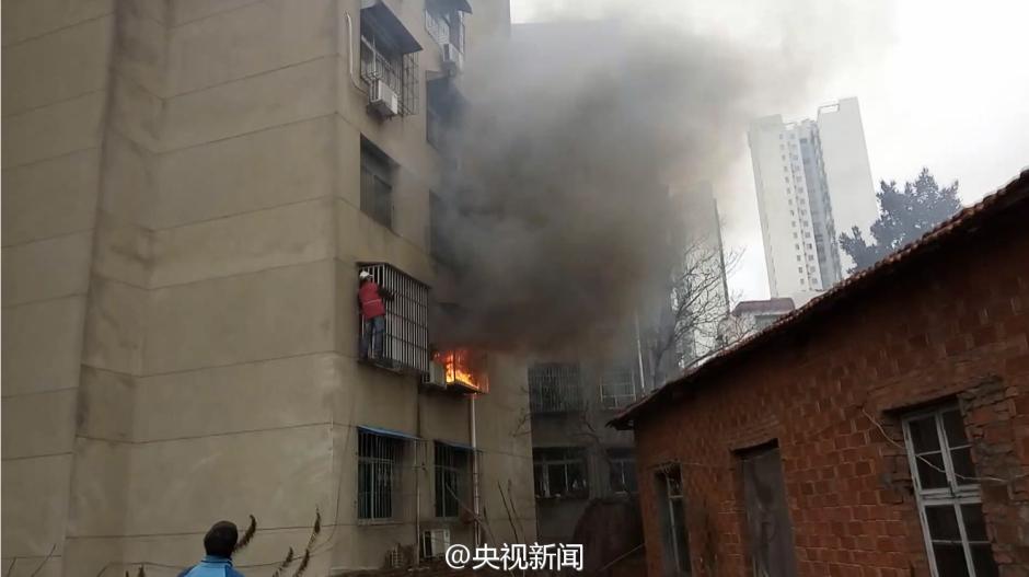 近日,湖北一户居民家着火冒出滚滚浓烟,一女子被防盗网困??!对面小区整理包裹的快递员张洋见状跑来,徒手爬上阳台,用手肘使劲撞开防盗网,终将女子救出!(央视记者吴绍钧)