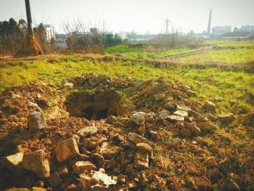 网友所发现的这个被盗古墓,位于新龙村一块没有种粮食的农田,有两个明显的洞,其中一个洞口大约有1平方米,深约1米左右,四处散落的泥土里有不少的砖块,上面有菱形图案。