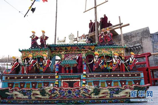 2月22日,几位塔尔寺的僧人将做好的酥油花拉向展台。当日,位于青海省西宁市湟中县境内的藏传佛教名寺塔尔寺举行酥油花展,吸引众多游客前来参观。酥油花是塔尔寺“艺术三绝”之一,由寺院艺僧以酥油为原料精雕细捏而成,以神像、人物、飞禽走兽、花草树木等为主要内容,形象逼真、色彩丰富,具有很高的艺术水平和独特的艺术魅力。新华社记者 吴刚 摄