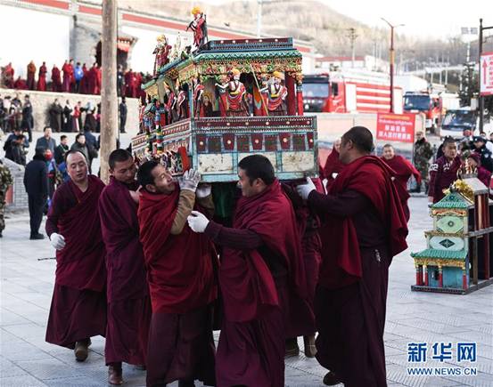 2月22日,几名塔尔寺的僧人将做好的酥油花抬向展台。当日,位于青海省西宁市湟中县境内的藏传佛教名寺塔尔寺举行酥油花展,吸引众多游客前来参观。酥油花是塔尔寺“艺术三绝”之一,由寺院艺僧以酥油为原料精雕细捏而成,以神像、人物、飞禽走兽、花草树木等为主要内容,形象逼真、色彩丰富,具有很高的艺术水平和独特的艺术魅力。新华社记者 吴刚 摄