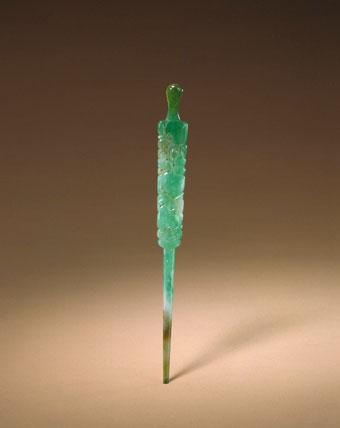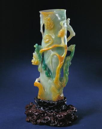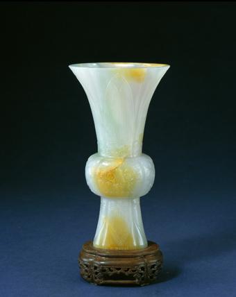 故宫博物院收藏翡翠作品800多件,是全国乃至全世界收藏古代翡翠最多的博物馆,藏品主要为清宫遗存,其中帝后玺册20余件,首饰、服饰类作品400多件,其他器物300多件,这些藏品的时代多为清代中、晚期。图为翠乾隆款仿古觚。
