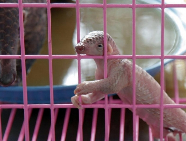 当地时间2011年4月20日,泰国曼谷,一只穿山甲幼崽抓住笼子。泰国海关当日清晨截获一辆载有175只走私穿山甲的卡车。