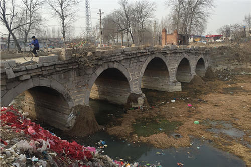 这座400多岁的古桥,至今仍是合河村村民进出的重要通道,行人、电动车、小汽车往来穿梭。但是,这座见证了大运河一片繁荣的古桥,如今却是残破不堪,四周垃圾缠身(如图)。