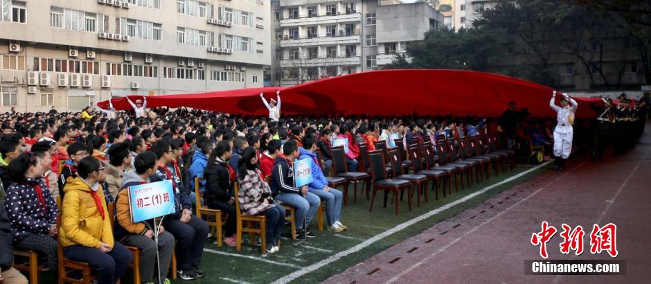 2016年02月24日,重庆市新区,渝高中学,开学典礼上同学们传递一面90米宽的巨大党旗??У谝豢斡赡羧僬樵С铝泄荼ǜ嫱懦稍蔽切怖弦槐参薏准陡锩业姆峁ξ凹āM嘉谴菀幻?0米宽的巨大党旗。 图片来源:视觉中国