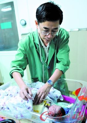 3月1日起,广州新生儿可享受免费疾病筛查服务。图为广医三院儿科主任崔其亮在为新生儿做检查。(资料图片) 广州日报记者乔军伟 摄